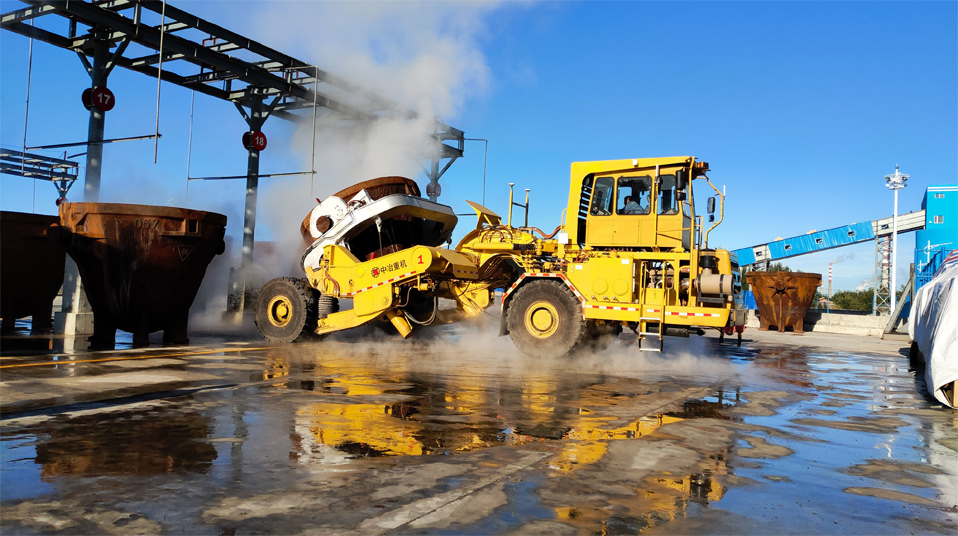 由中冶宝钢研制的70吨铰接式抱罐车,采用鹅颈铰接型式,额定载重75吨,重载最高时速为每小时20公里,翻罐角度105度,最大爬坡能力8%,最小转弯半径9米。该车型应用专利技术10项,在国内有色冶炼市场占有率超过75%,先后荣获中国有色工业协会、中国钢铁工业协会科技奖,中国施工企业管理和中国循环经济协会专利奖等荣誉。